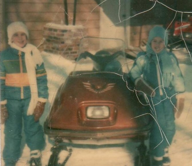 Driving the snowmobile, age 5, on the sidewalks of New Baltimore, just before I tipped it over at the curb.